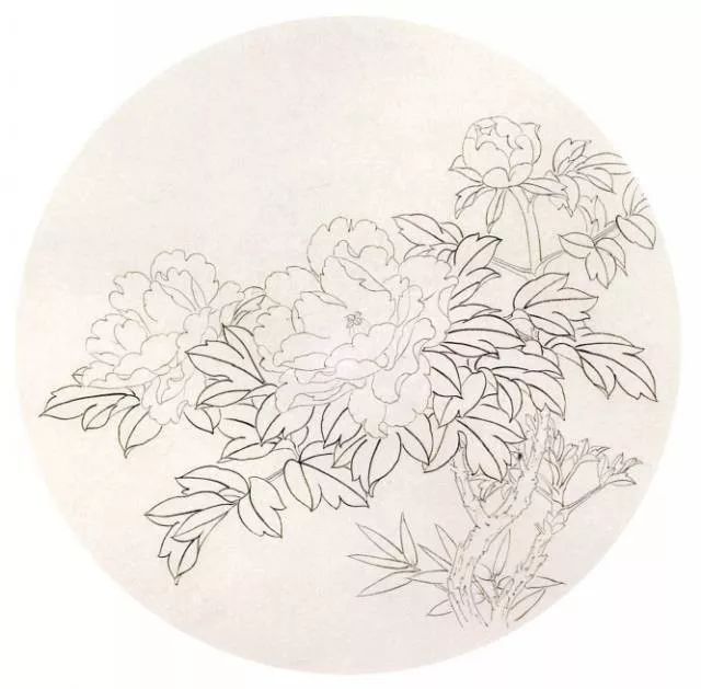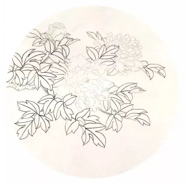 步骤一:因花为重色,用中墨勾花,重墨勾叶。牡丹花瓣较薄,用线要细些,叶子用线要比花粗,而且粗细要有变化。