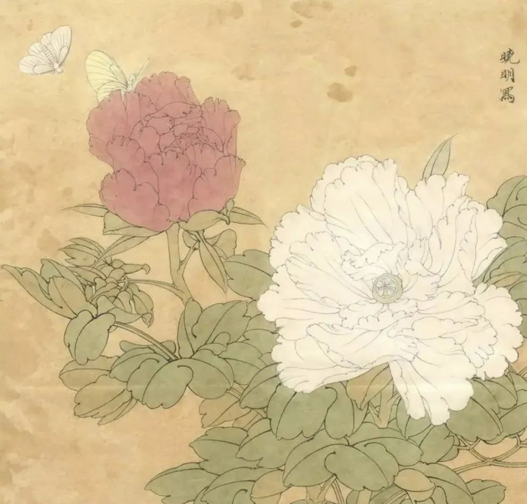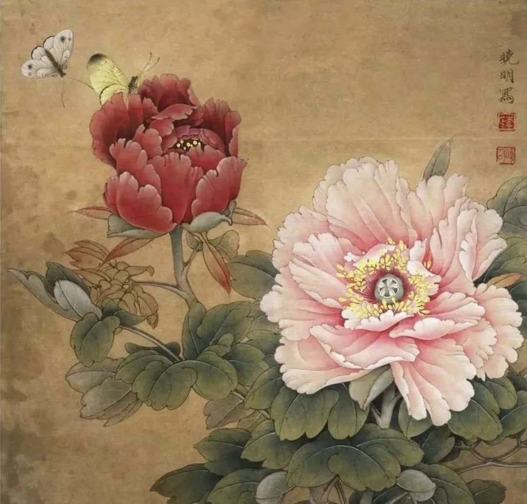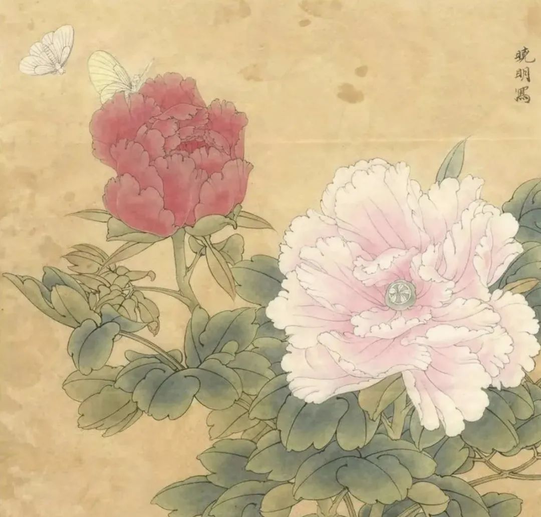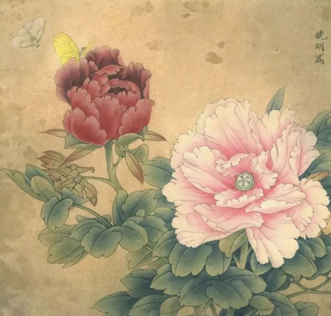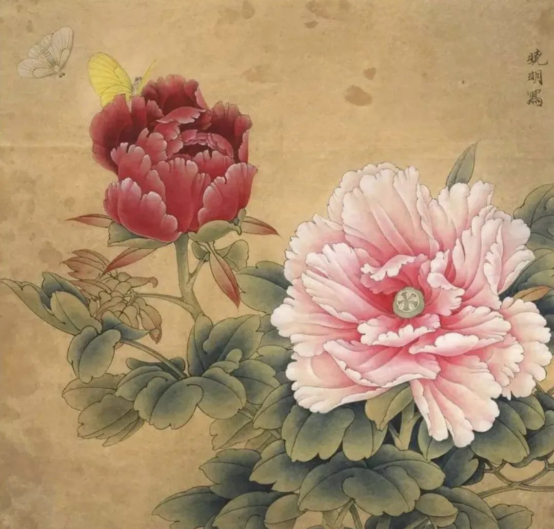 ? ? ? ??本作描绘了深浅二色的牡丹,配上两支活泼可爱的粉蝶飞舞其间,构图简约、合理,出枝、穿插疏密有致,是一张具有浓郁古典气息的牡丹小品范例。在用色上追求一种“古艳”效果,通过仿古底色的刷制,尤其是那种模仿古旧绫绢纹理的肌理制作,既保留了工笔重彩的华贵艳丽,又体现了古色古香的传统神韵。