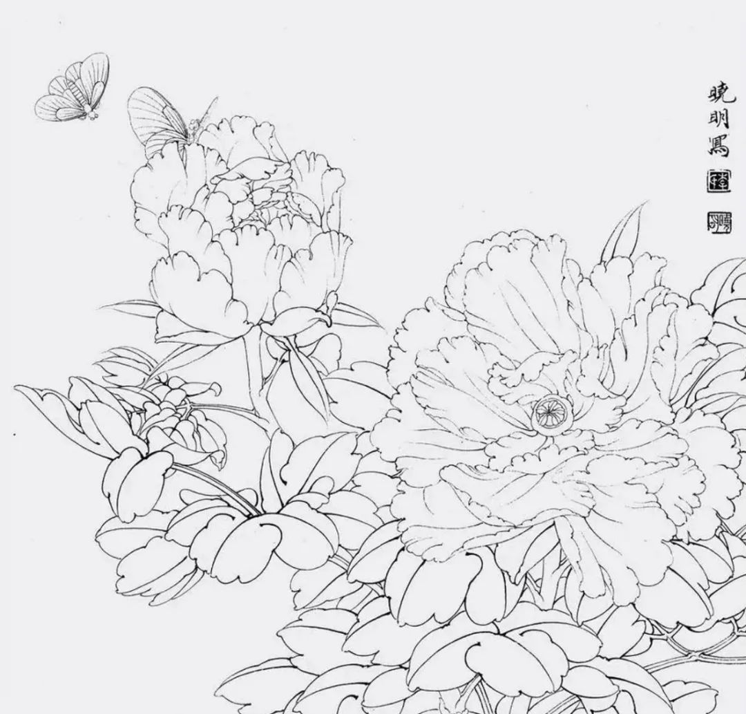 ? ? ? ??浅色花头用淡墨勾勒,深色花头用中墨勾勒,重墨勾叶。蝴蝶用中墨游丝描细心勾勒。下方老干中墨干笔侧锋勾勒。